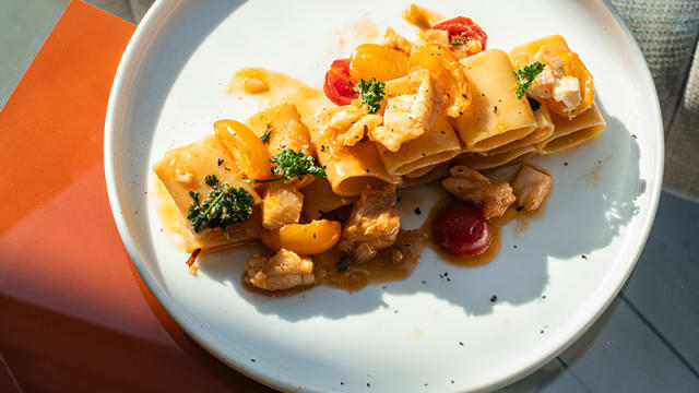 Pacchero trafilato al bronzo con baccalà mantecato, doppio pomodorino giallo e rosso guarnito e aromatizzato con polvere di limone giapponese