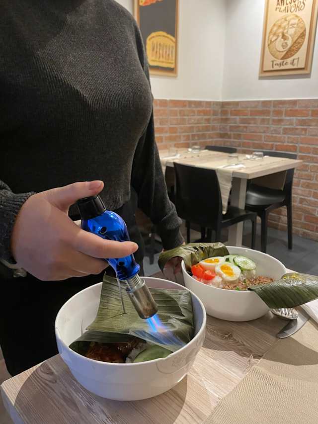 - Maiale arrosto con salsa di soia ricoperto di foglie di banana Incluso: riso bianco, pomodorini/cetrioli e uovo sodo