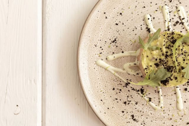 Crescenza, prescinsêua, salsa di ciliegino giallo, acciughe, capperi, stracciatella di burrata, olive taggiasche, terra di olive, olio E.V.O.