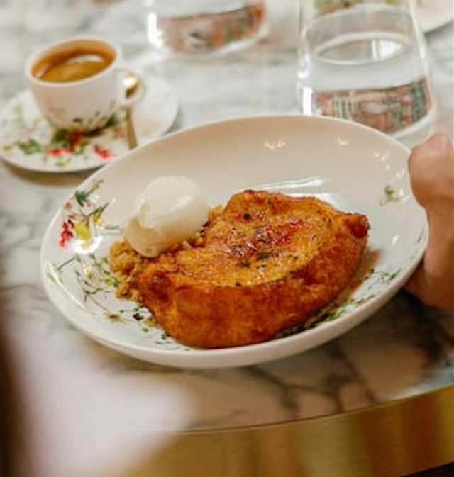 - Torrija brioche ligeramente caramelizada y helado de leche merengada