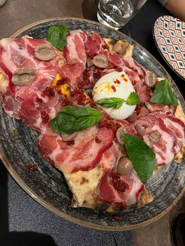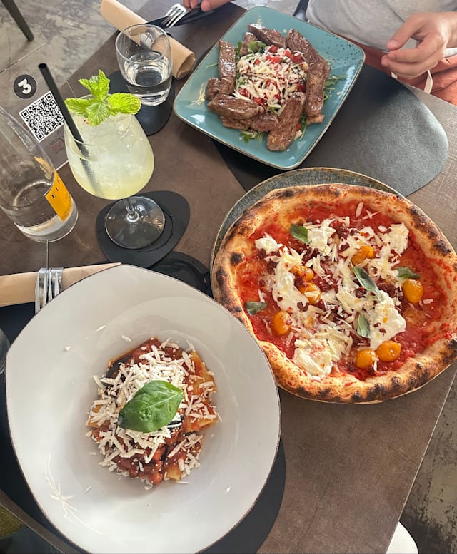 10/10This is a lovely restaurant with friendly efficient staff and amazing food. We shared antipasti as a starter which was excellent. My son had the spicy pizza which lived up to it's name but he loved it. I had the pistachio and bacon pasta and it was delicious. Out waitress recommended a perfect wine for us. We really enjoyed our meal and the atmosphere and will definitely be back