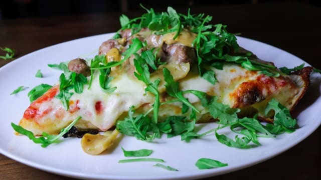 Pane fatto in casa, hamburger*, funghi porcini trifolati, fonduta di brie, speck croccante, spinacini freschi, maionese alla menta