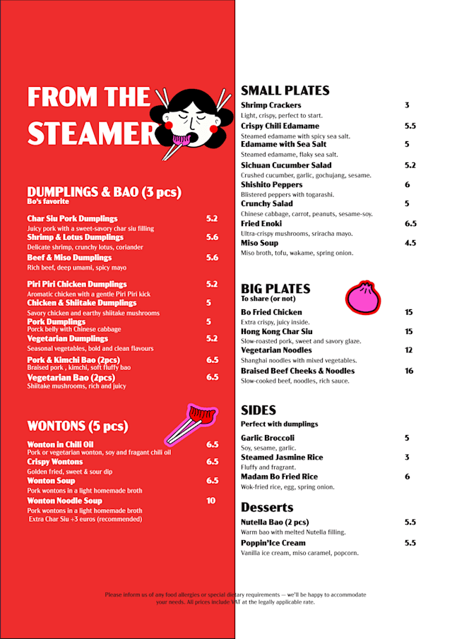 Hi there, Thank you for taking the time to share such detailed feedback both on google and here. We’re sorry to hear that your visit didn’t meet expectations — from the temperature of the wontons and dryness of the bao to the service experience you described. This is not the impression we want to leave. We would like to clarify that all of our prices, including water, are listed on the menu, but we’ll review how clearly this is communicated to avoid any confusion in the future. Regarding the end of your meal, our intention was not to rush you out — we had a booking for a large group of 15 guests and therefore invited you to continue your evening at the bar so we could prepare the table. We appreciate your honesty and will be addressing these points directly with our team. We hope you’ll consider giving us another chance to provide you with the full Madam Bō experience we strive for. — The Madam Bō Team