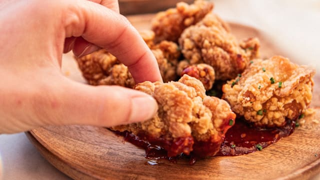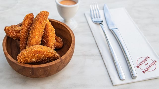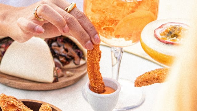 Crevettes panées en tempura, mayonnaise japonaise et sauce sweet chili