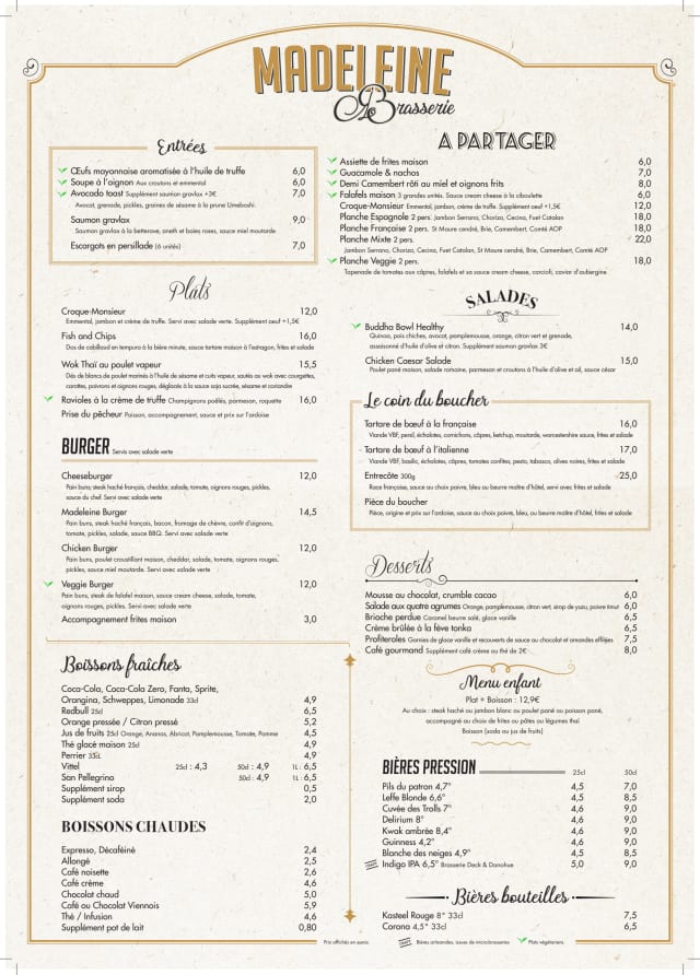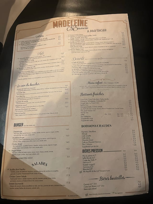 6.5/10Expecting a more upscale setting with great food. The food was more like a bar or tavern menu. Tables were packed tightly to one another. Location was confusing as we were first sent to Le Madeleine a totally unrelated restaurant in a different part of Paris. Would not return.