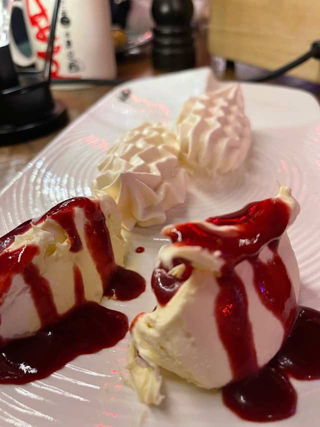 - De la laiterie de gruyère avec coulis de fruits rouges