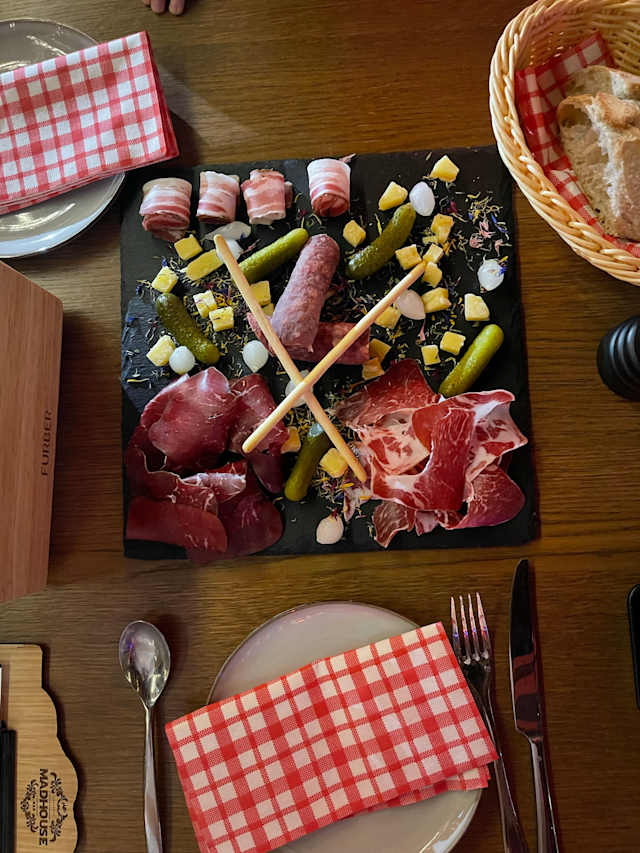 - (260gr) coppa des grisons, saucisse à l’ail, lard cru coupé, viande séchée, sbriny AOP, noix, oignons blancs, cornichons et pain
