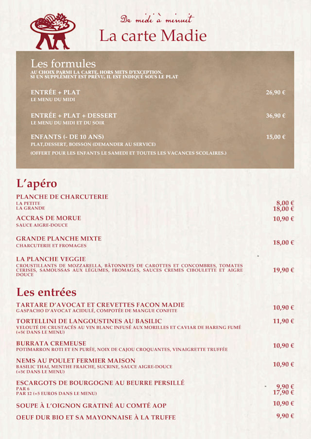 9.5/10A good surprise in a neighborhood where it's not easy to find good food at an affordable price. Madie passes this challenge, offering a wide assortment of French food at a reasonable fare, especially in Paris. The cherry on the cake is the attentionate service. Well done Madie .