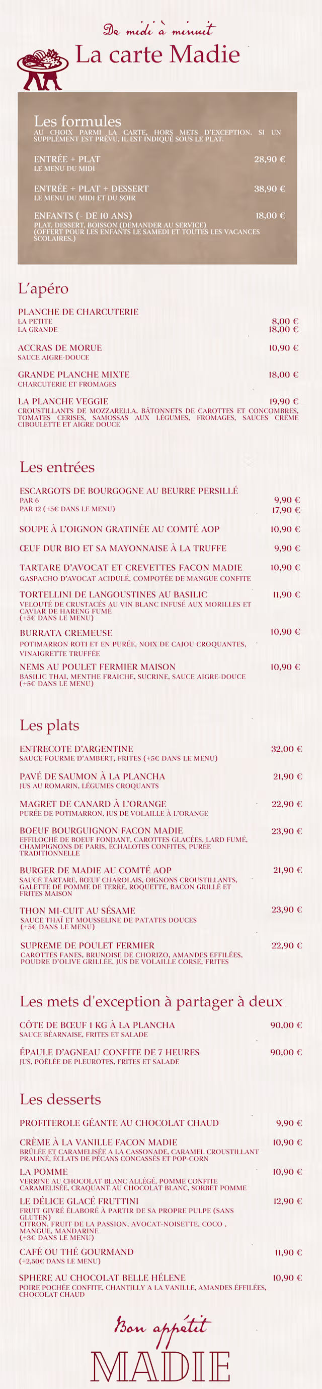 MadieThank you for taking the time to share your feedback. We’re sorry to hear that our menu didn’t meet your expectations. At Madie Paris, we aim to offer refined French cuisine using fresh, high-quality ingredients, in an elegant and welcoming setting near La Madeleine. We understand that perceptions of value and creativity can vary, and we take your comments seriously as we continue to evolve our menu. We hope to have the opportunity to welcome you again and offer an experience that better reflects our standards.