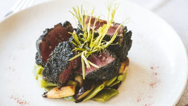 Petto d'anatra con crema di zucca, polvere di liquirizia e fondo bruno alla liquirizia