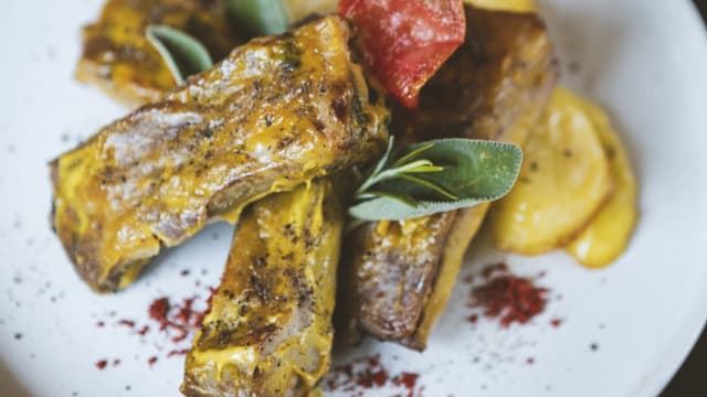 Costicine cotte a bassa temperatura con senape, miele e pepe affumicato al legno di melo