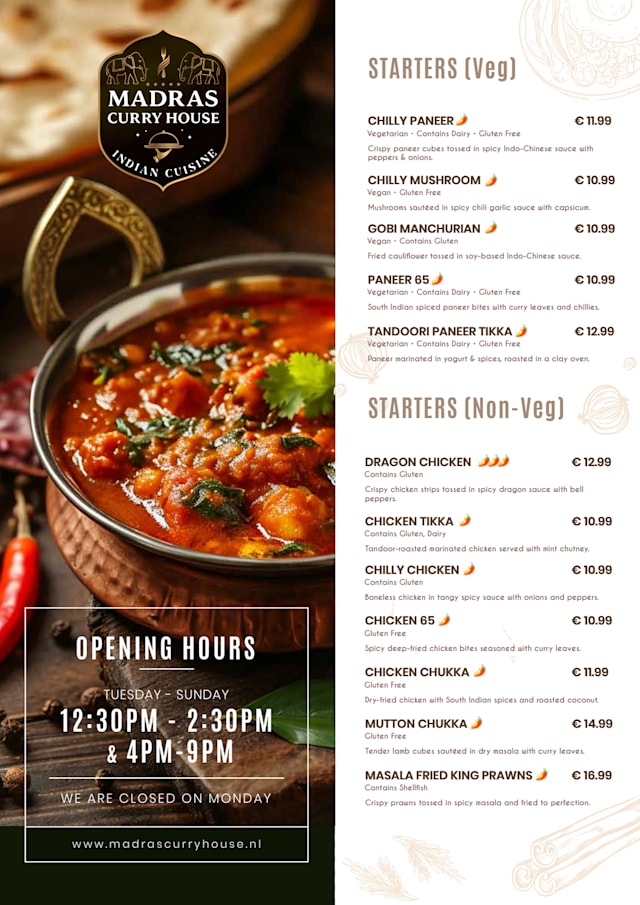 Thank you for your wonderful feedback. We are delighted to know you enjoyed your dinner and appreciated the customized spice levels. It means a lot to be considered a great addition to Veldhoven. We look forward to welcoming you again soon. Warm regards, Team Madras Curry House