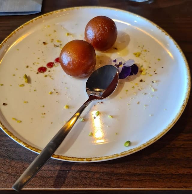 Soft cheese patties soaked in saffron milk with almonds.