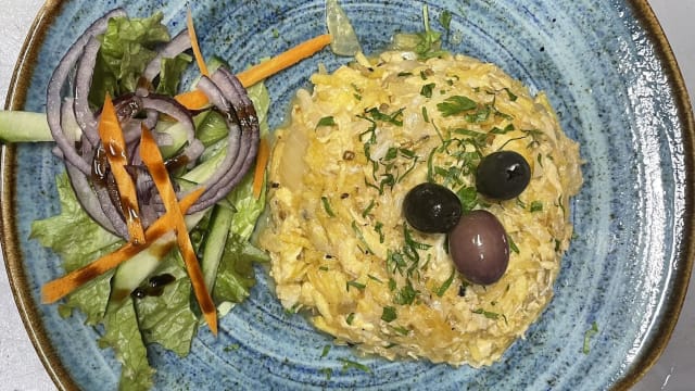 (Fried cod fish with onion, garlic crispy potatoes and eggs)