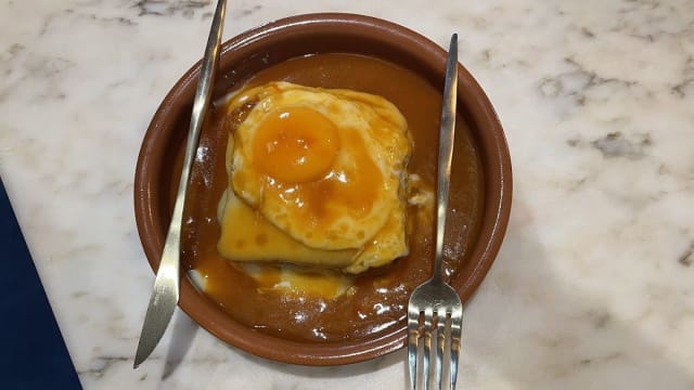 (Francesinha is a Portuguese sandwich originally from port,made with bread, wet cured ham fresh sausage, roast meat and egg, covered with melted cheese and a hot and thick sauce serve with fries.)
