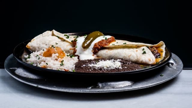 Tortilla grande di grano arrotolata e farcita con pulled beef, fagioli, formaggio, verdure miste, salsa piccante & crema. Contorni riso e fagioli