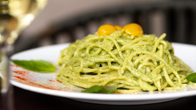 Vin blanc, pistache, tomates cerises, crème, persil et crème de buratta