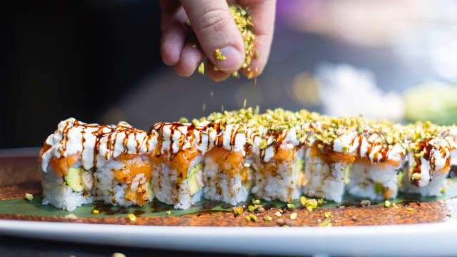 In: salmone** in tempura, avocado. Out: slice di mango, stracciatella pugliese del caseificio gioiella, granella di pistacchio, salsa teriyaki.