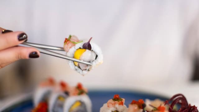 In: gambero* in tempura, avocado, erba cipollina. Out: slice di branzino** scottato, maionese giapponese, tartare di gambero rosso**, polpa di ricci*, tobiko, salsa ponzu, zest di lime.