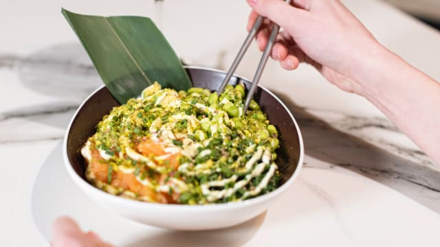 Riso, salmone**, avocado, erba cipollina, alga wakame*, edamame*, salsa allo yogurt, granella di pistacchio.
