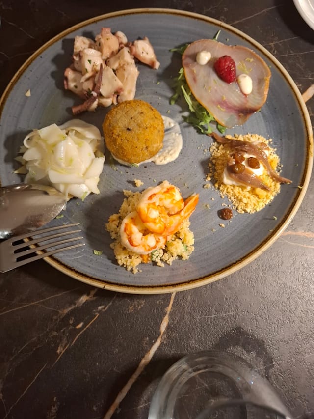 TAGLIOLINO NERO SU CREMA DI BRONTE E TARTARE DI GAMBERO ROSSO