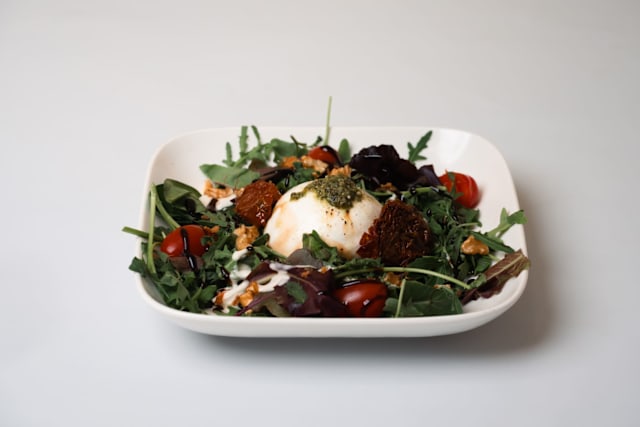 Crème tomatée, oignons, épinards, tomates confites. Accompagnement au choix pour tous les plats: pâtes ou croquettes. Tous les plats sont accompagnés de salade.