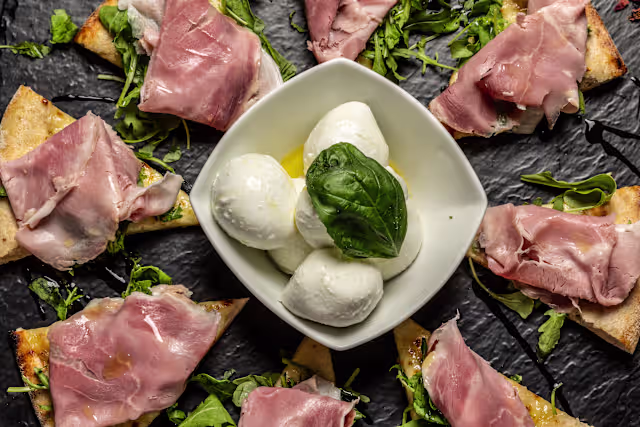 - Mozz. fior di latte, gorgonzola DOP, mozz. Di bufala campana, prosciutto crudo di parma