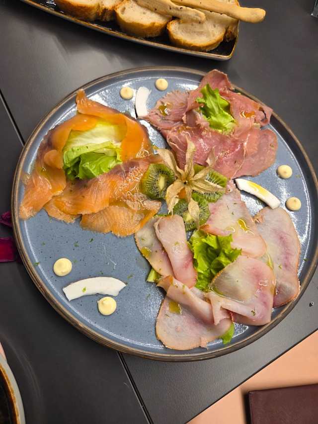 - Tagliere di salumi di mare con pesce spada, tonno e salmone con 3 tipi di mayo (classica, lime, basilico) e grissini al sesamo