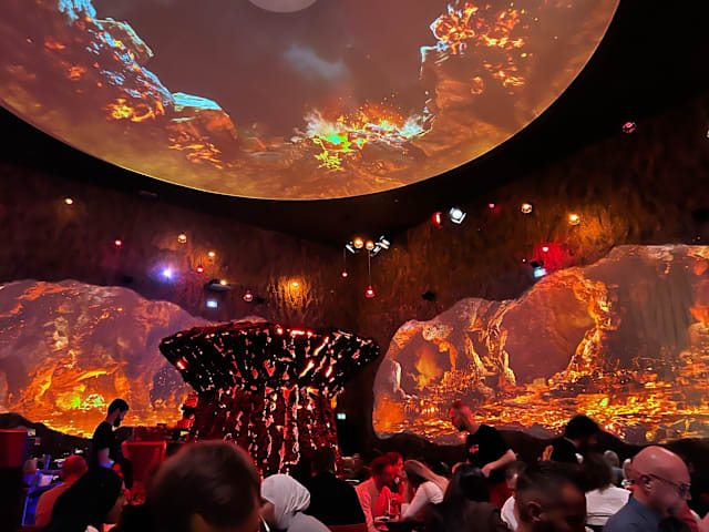 7.5/10Kind of kitsch concept, supposed to be depicting scenes from inside of a volcano. The open kitchen caused a very stiff air and burning smell from flaming the tatakis. Very crowded seating. Food was good, prices were fair for what you get. It’s not fine dining, so I don’t get all the hype.