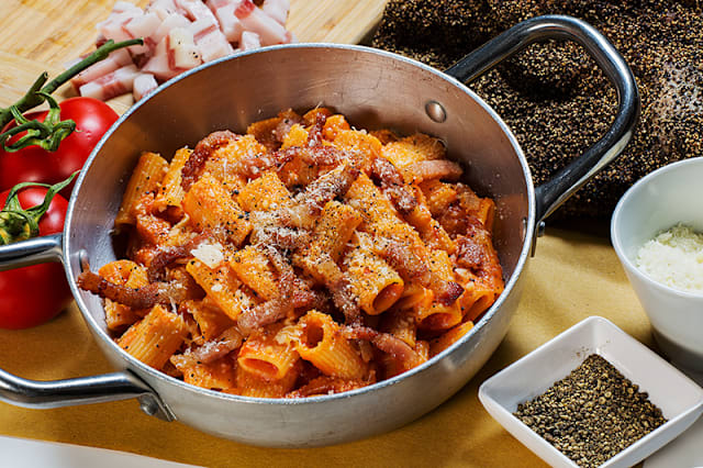 - Salsa di pomodoro', guanciale, pecorino romano, vino biance, pepe