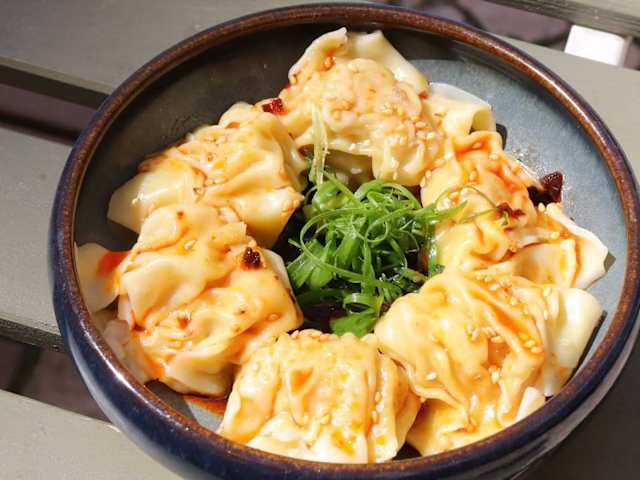 - Ramen sem caldo, com molho cremoso picante à base de pasta sésame, servido com wontons caseiros e legumes frescos