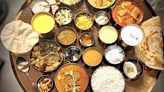 (kerala meals with an assortment of traditional accompaniments such as thoran (veg), chammandhi (veg), pickles, raita, pappadam and veg/fish/chicken/beef/lamb curry served in a chatti (clay-pot) with kerala red rice, the fun is to mix everything in the clay-pot and relish it in a traditional way! )
