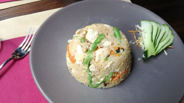 Riso saltato, pollo, carote, fagiolini lunghi, uova. basilico thai, cipolla, salsa di soia, salsa di ostriche