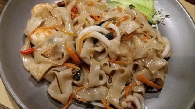 Tagliatelle di riso, mazzancolle tropicali, calamari indopacifici, foglie di Kaffir, carote, basilico thai, salsa di ostriche, funghi, salsa di pesce, chilli, katchai, pepe