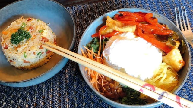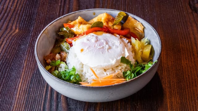 Riso con bocconcini di branzino, uovo all'occhio di bue, carote, peperoni, papaya fermentata, cipolla caramellata, cipollotto, coriandolo e salsa sweet chilli