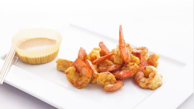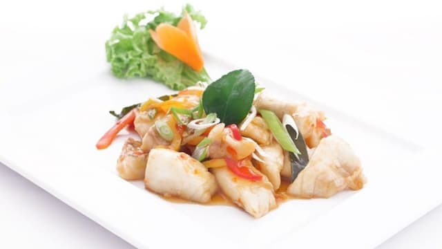 Riso con bocconcini di branzino, uovo in camicia, carote, peperoni, papaya fermentata, cipolla caramellata, coriandolo, cipollotto e salsa sweet chilli.