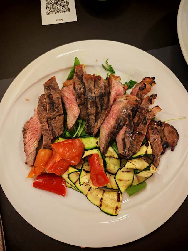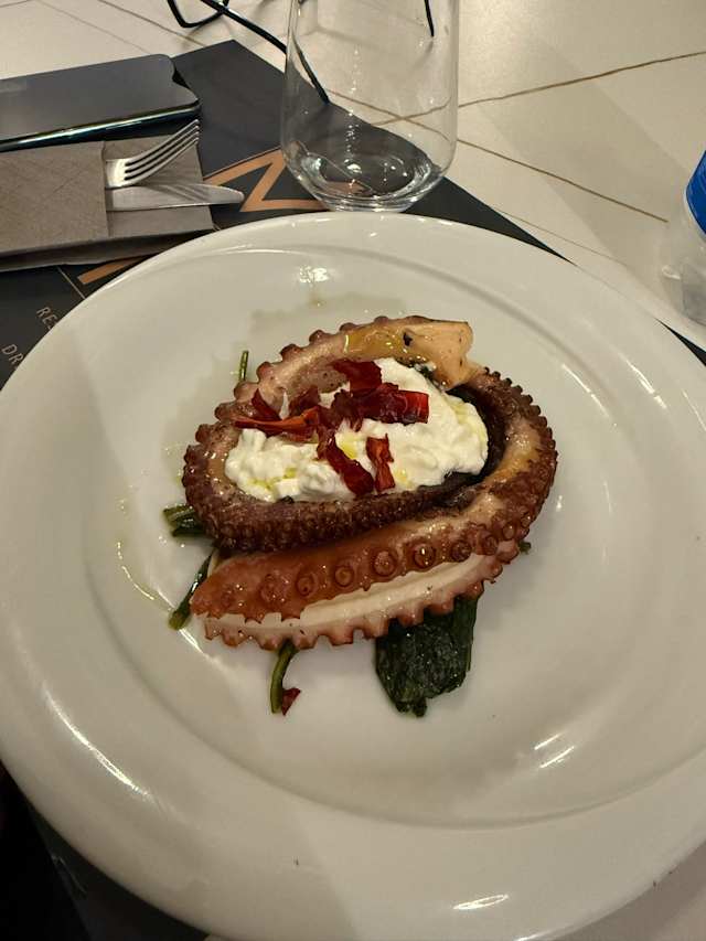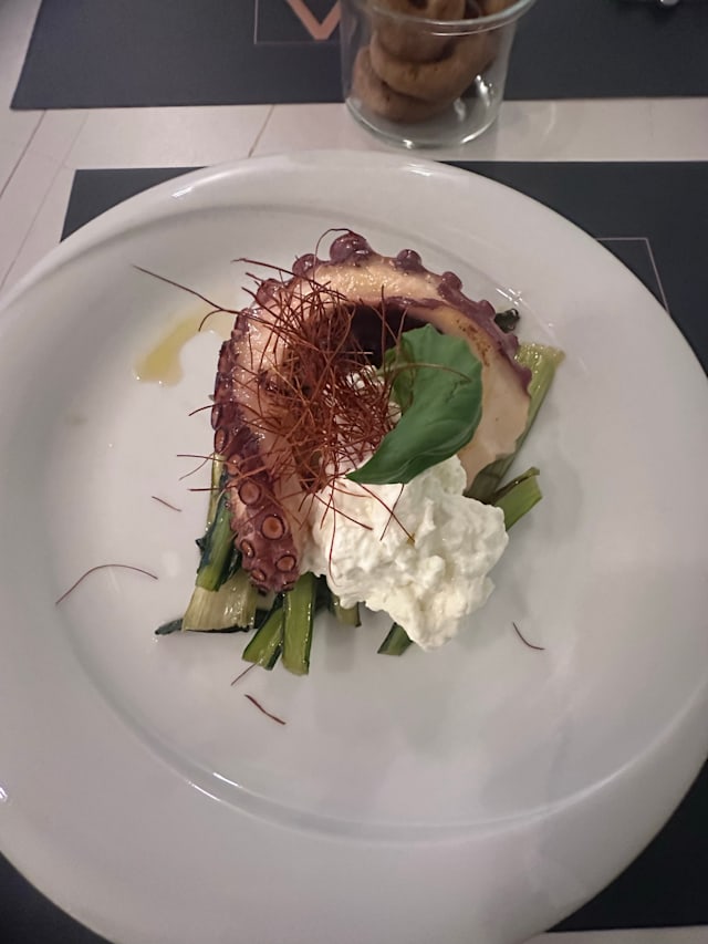 - Polpo scottato, datterino giallo, stracciatella, cipolla rossa e rucola