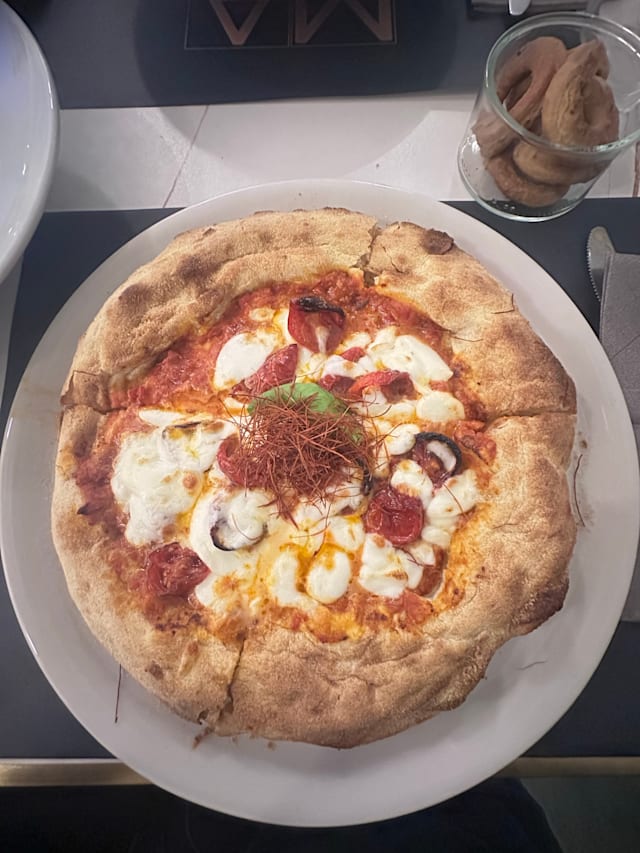 - Fior di latte in cottura, pomodorini confit, bomba pugliese, fili di peperoncino e basilico