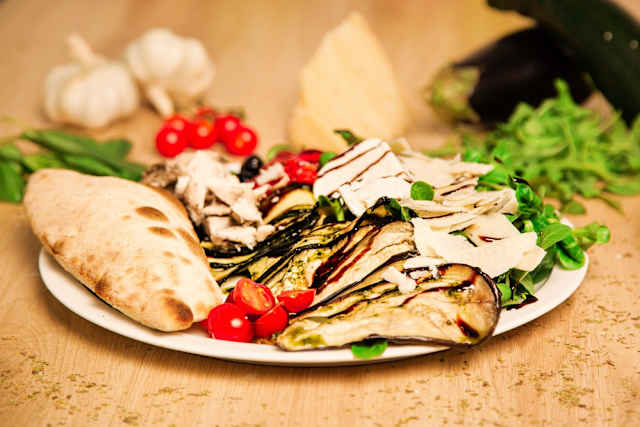- Salade verte, poivrons grillés, aubergines grillées, courgettes grillées, oignons grillés, tomates cerises, olives noires, pesto basilic, filet de crème de balsamique, copeaux de parmigiano reggiano, mozzarella di bufala, poulet mariné aux herbes et oignons, petit pain maison.