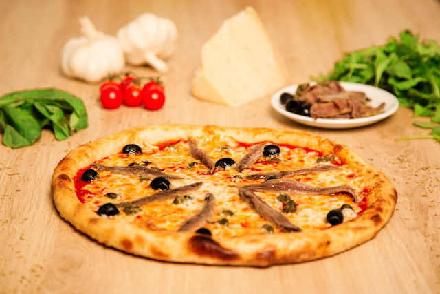 - Sauce tomate, fior di latte, câpres, olives, anchois