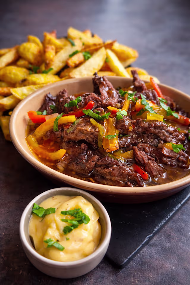 - Emincé de bavette mariné, écrasé de pomme de terre, poivrons et sauce tigre qui pleure