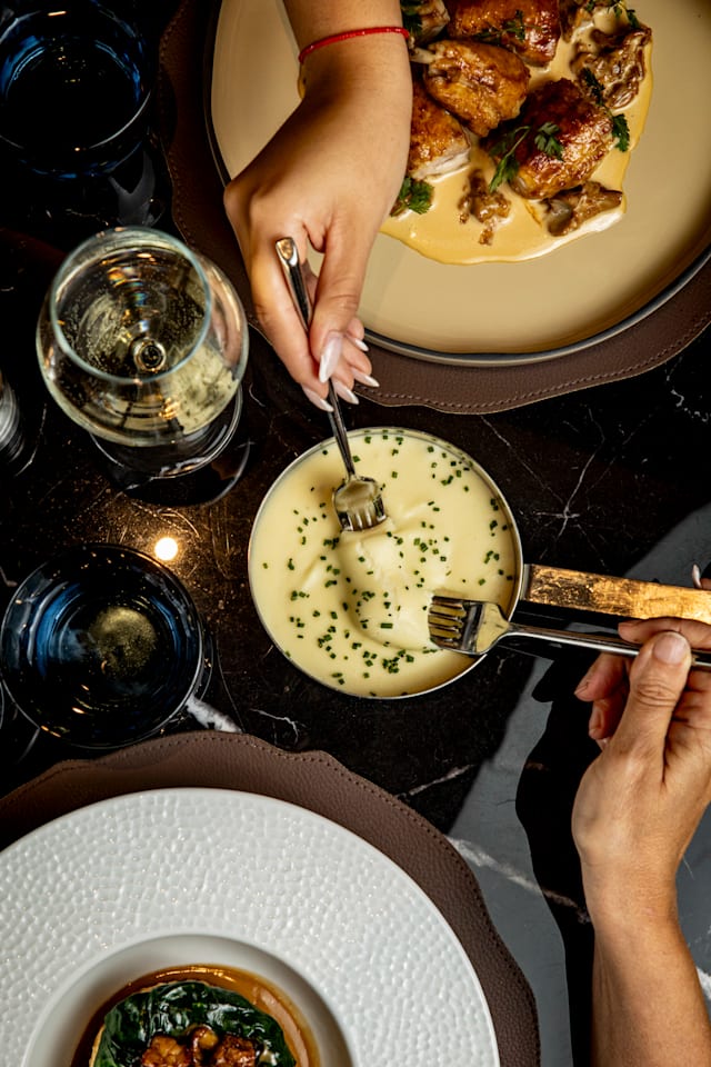- Côte de veau (à partager), sauce au vin jaune et morilles, purée de pommes de terre