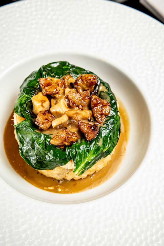 - Chou farci aux champignons, lentilles et carottes, jus de légumes réduit