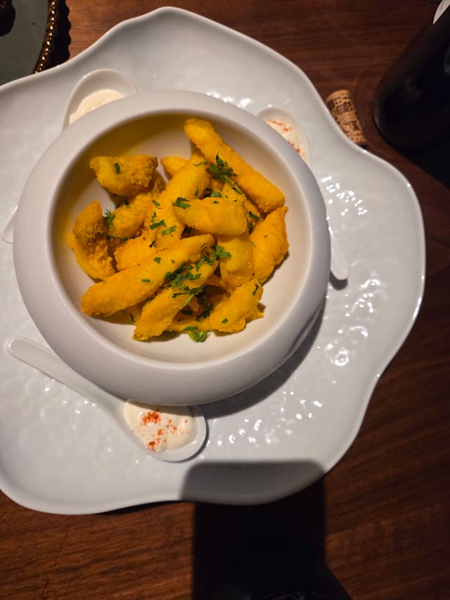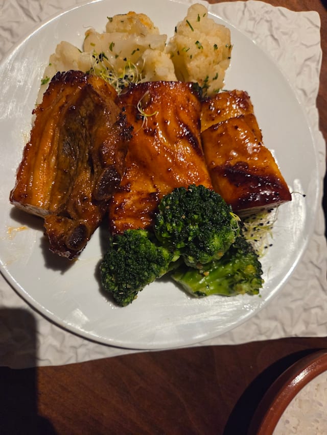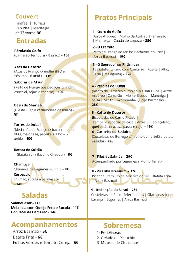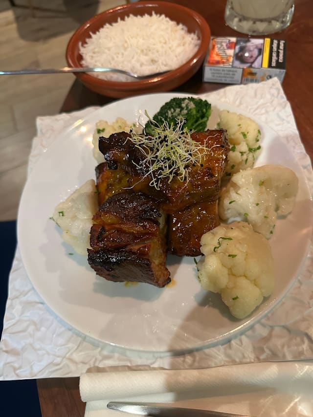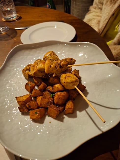 6.5/10Interesting food choices reflectin a Middle East / Portugese fusion However very little choice . Some executed excellently ..the lamb shank and lamb chops . Some not so good ..the steak ( billed as veal loin on the menu ..but a basic fillet steak ) and average ceviche and tuna . House white wine very dissapointing( lacked any body ..and next cheapest bottle 26 € for an average wine . Staff attentive but some need more training resulting in a starter being brought which was different to that which was ordered. A seconfd bottle of wine was opened without anyone at the table requesting it ..resulting in embarrasment when declined.