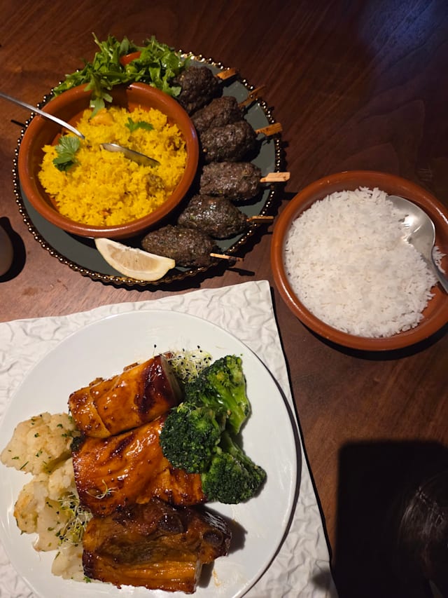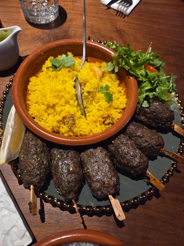 3/10Terrible experience and great disappointment. Ridiculous list of cocktails served in tiny quantity over a huge lump of ice. A glass of rose wine was ordered but a glass of white wine was served. Again, in a large glass but a very small amount of wine. One half of my lamb shank was completely burnt and the rice was swimming in a watery and VERY salty sauce. It was not edible. Incinerated meat that should never have left the kitchen. This is NOT proper Middle Eastern food. Staff, running around not quite knowing what they were doing. Better staff training and a genuine Middle Eastern Chef, would make all the difference. The hostess could also do with some good manners.