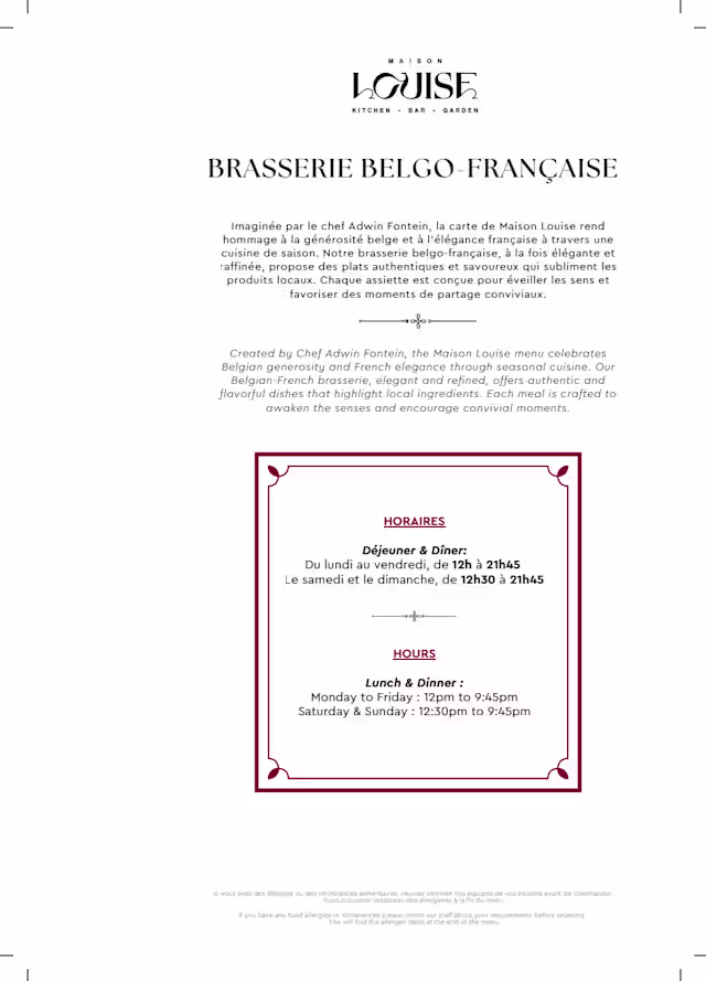 Maison Louise Kitchen Bar GardenBonjour Gary, Merci d’avoir pris le temps de partager votre expérience à Maison Louise – Kitchen. Bar. Garden. Nous sommes sincèrement désolés d’apprendre que votre repas n’a pas été à la hauteur de vos attentes. Nous vous remercions malgré tout d’avoir souligné la gentillesse de notre équipe en salle – c’est un aspect auquel nous tenons particulièrement. Concernant vos remarques sur le pain et le plat de poulpe, nous en avons informé notre chef de cuisine afin qu’un suivi soit fait avec l’équipe en cuisine. Votre retour nous aide à nous améliorer continuellement. Nous espérons avoir une nouvelle occasion de vous accueillir et de vous offrir une expérience à la hauteur de nos standards. Bien à vous, L’équipe Maison Louise