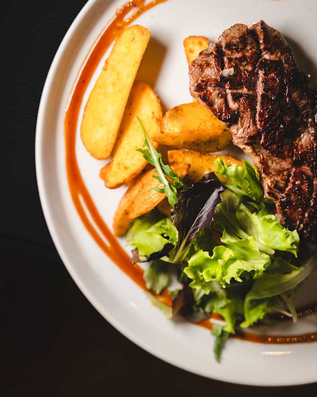 - Flat Iron Steak, potato wedges al rosmarino, friggitello napoletano e chimichurri mediterraneo ai pomodori secchi