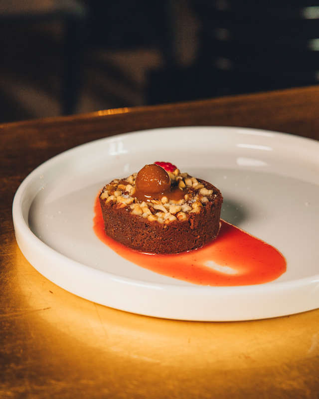 - Brownie fondente vegano con coulis di frutti di bosco e menta fresca
