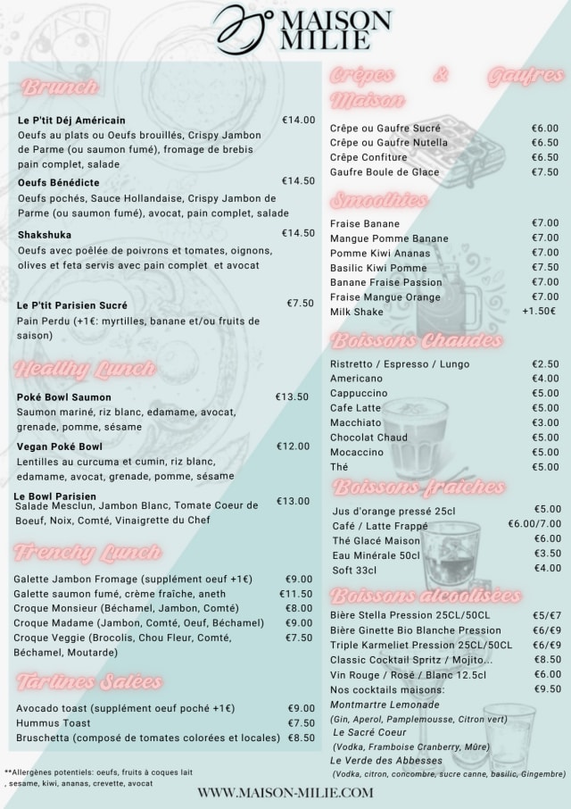 10/10Great place for a casual brunch or lunch in Montmartre! Very friendly service and the food is terrific. I can personally recommend the shakshuka and the salmon benedict but, really, everyone we have eaten with at Maison Milie has been very happy with their dishes.