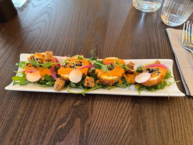 - Œuf mollet, pané à l’anglaise au panko, mayonnaise spicy et roquette